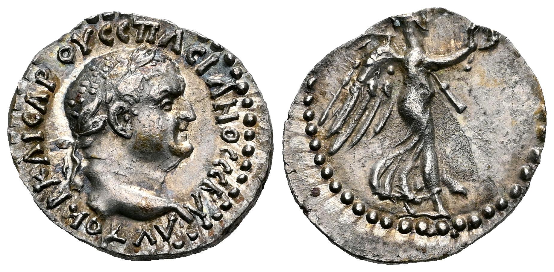 Vespasian. Hemidrachm. 69-79 AD. Caesarea-Eusebia. Cappadocia. (RPC-II 1659). (Sydenham-Caesarea 94). Anv.: AVTOKP KAICAP OVЄCΠACIANOC CЄBA, laureate head to right. Rev.: Victory advancing to right, holding wreath and palm. Ag. 1,94 g. Traces of luster and lightly toned. Rare in this condition. Ex Romae Aeternar Numismatics, Vcoins (11/03/2019). XF. Est...300,00.