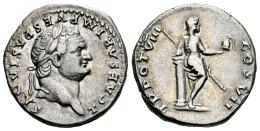Titus. Denarius. 79 AD. Rome. (Ric-1078 Vespasian). (Bmcre-255). (Rsc-332). Anv.: T CAESAR IMP VESPASIANVS, laureate head right. Rev.: TR POT VIII - COS VII, Venus, seen half from behind, naked except for drapery around legs, standing right, left elbow on column, holding helmet and spear. Ag. 3,59 g. Very rare. Ex Tauler&Fau 95 (02/11/2021), lot 409; Ex J. Vico 153 (07/03/2019), lot 412. Choice VF. Est...500,00.