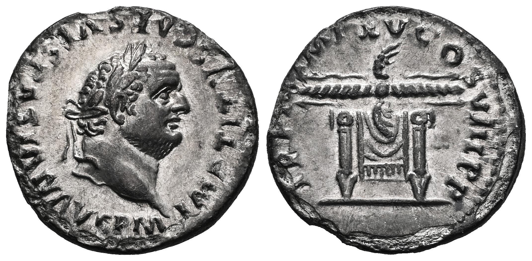 Titus. Denarius. 80 AD. Rome. (Ric-II 1 119). (Bmcre-51/54). (Rsc-316). Anv.: IMP TITVS CAES VESPASIAN AVG P M, laureate head to right. Rev.: TR P IX IMP XV COS VIII P P, pulvinar (throne) of Jupiter and Juno, with horizontal winged thunderbolt above. Ag. 2,31 g. Delicate patina. Original underlying luster. AU. Est...200,00.