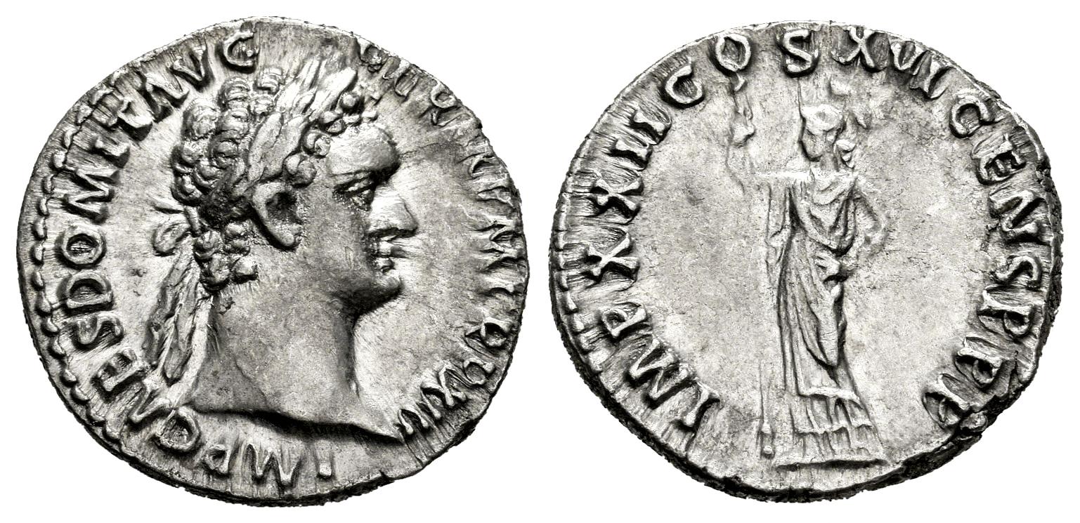 Domitian. Denarius. 93-94 AD. Rome. (Ric-II 1 763). (Bmcre-219). (Rsc-283). Anv.: IMP CAES DOMIT AVG GERM P M TR P XIII, laureate head to right. Rev.: IMP XXII COS XVI CENS P P P, Minerva standing to left, holding thunderbolt and spear; shield at side. Ag. 3,70 g. A good sample. Original luster. Ex Áureo & Calicó 220 (16/09/2009), lot 150. Almost XF. Est...200,00.