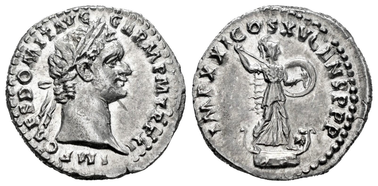Domitian. Denarius. 95-96 AD. Rome. (Ric-II 1 725). (Bmcre-183). (Rsc-270). Anv.: IMP CAES DOMIT AVG GERM P M TR P XI, laureate head to right. Rev.: IMP XXI COS XV CENS P P P, Minerva, holding shield and hurling spear, standing to left on prow, owl at her feet. Ag. 3,61 g. Magnificent piece. Plenty of original luster. Rare in this condition. Almost MS. Est...500,00.
