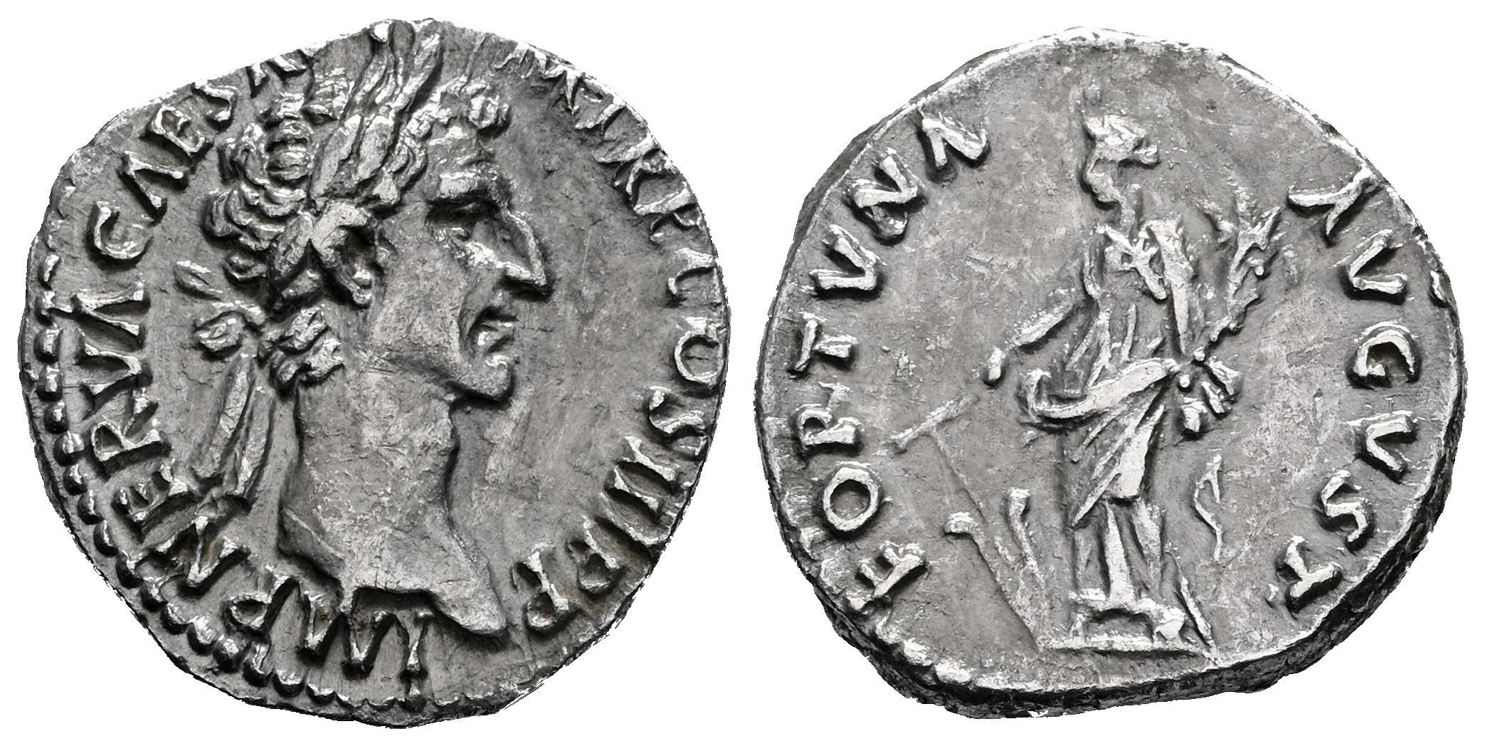 Nerva. Denarius. 97 AD. Rome. (Ric-II 16). (Bmcre-37). (Rsc-66). Anv.: IMP NERVA CAES AVG P M TR P COS III P P, laureate head to right. Rev.: FORTVNA AVGVST, Fortuna standing facing, head to left, holding cornucopiae and rudder. Ag. 2,98 g. Almost XF. Est...160,00.