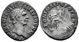 Trajan. Denarius. 98 AD. Rome. (Ric-II 22). (Woytek-38a). (Bmcre-21). Anv.: IMP CAES NERVA TRAIAN AVG GERM, laureate head to right. Rev.: PONT MAX TR POT COS II, Victory seated to left, holding patera and palm branch. Ag. 3,51 g. Minor scratches. Deposits. Almost VF. Est...70,00.