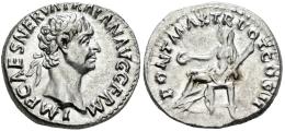 Trajan. Denarius. 98-99 AD. Rome. (Ric-II 21). (Woytek-32a). (Bmcre-2). Anv.: IMP CAES NERVA TRAIAN AVG GERM, laureate head to right. Rev.: PONT MAX TR POT COS II, Vesta seated to left, holding patera and torch. Ag. 3,56 g. Plenty of original luster. Worn reverse die. Scarce in this grade. Almost MS/AU. Est...400,00.
