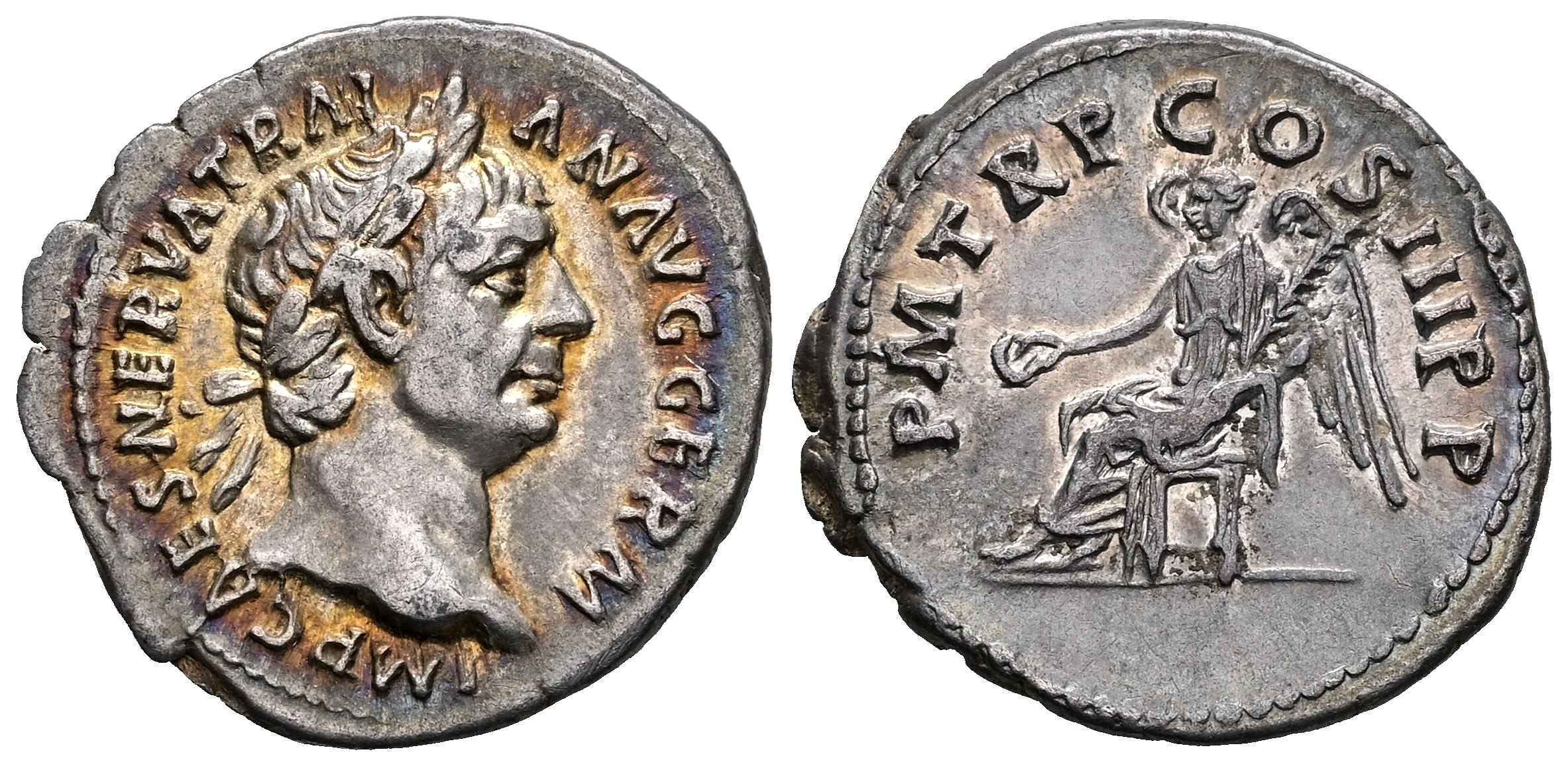 Trajan. Denarius. 100 AD. Rome. (Ric-II 41). (Woytek-85a). (Bmcre-77). Anv.: IMP CAES NERVA TRAIAN AVG GERM, laureate head to right. Rev.: P M TR P COS III P P, Victory seated to left, holding patera and palm. Ag. 3,43 g. Striking iridescent tone with golden sparkles, a soft patina and underlying original luster, all this presents us with this excellent specimen of exquisite presence. Almost XF. Est...300,00.