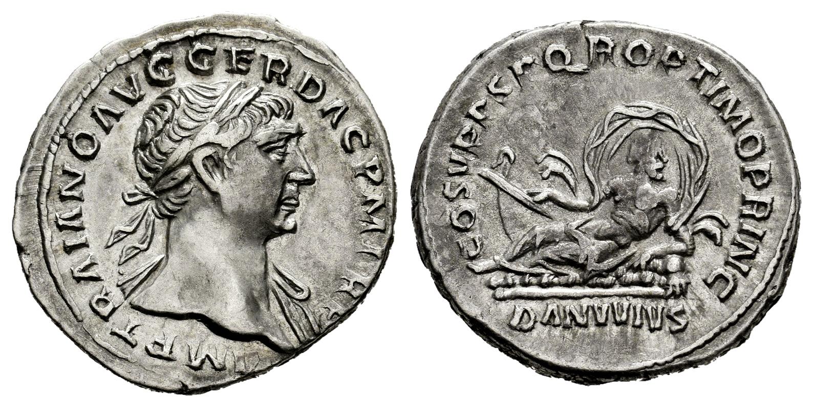Trajan. Denarius. 107-108 AD. Rome. (Ric-II 100). (Woytek-277b). (Bmcre-395). Anv.: IMP TRAIANO AVG GER DAC P M TR P, laureate bust to right, slight drapery on far shoulder. Rev.: COS V P P S P Q R OPTIMO PRINC, Danuvius reclining to left on rocks, hand on ship's prow; above, cloak floating, DANVVIVS in exergue. Ag. 3,22 g. Ex Gorny & Mosch (09/03/210), lot 1996. Almost XF. Est...200,00.