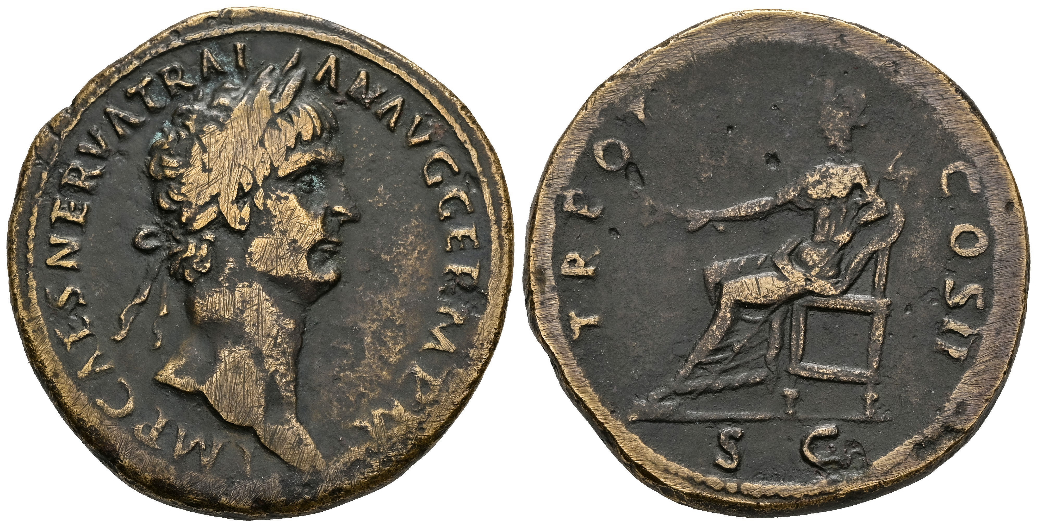 Trajan. Sestertius. 98-117 AD. Rome. (Ric-390). (Woytek-27a). Anv.: IMP CAES NERVA TRAIAN AVG GERM P M. Laureate head right. Rev.: TR POT COS II. Pax seated left on throne, holding branch and sceptre; S C in exergue. Ae. 24,28 g. Hairlines. Scarce. Almost VF. Est...90,00.