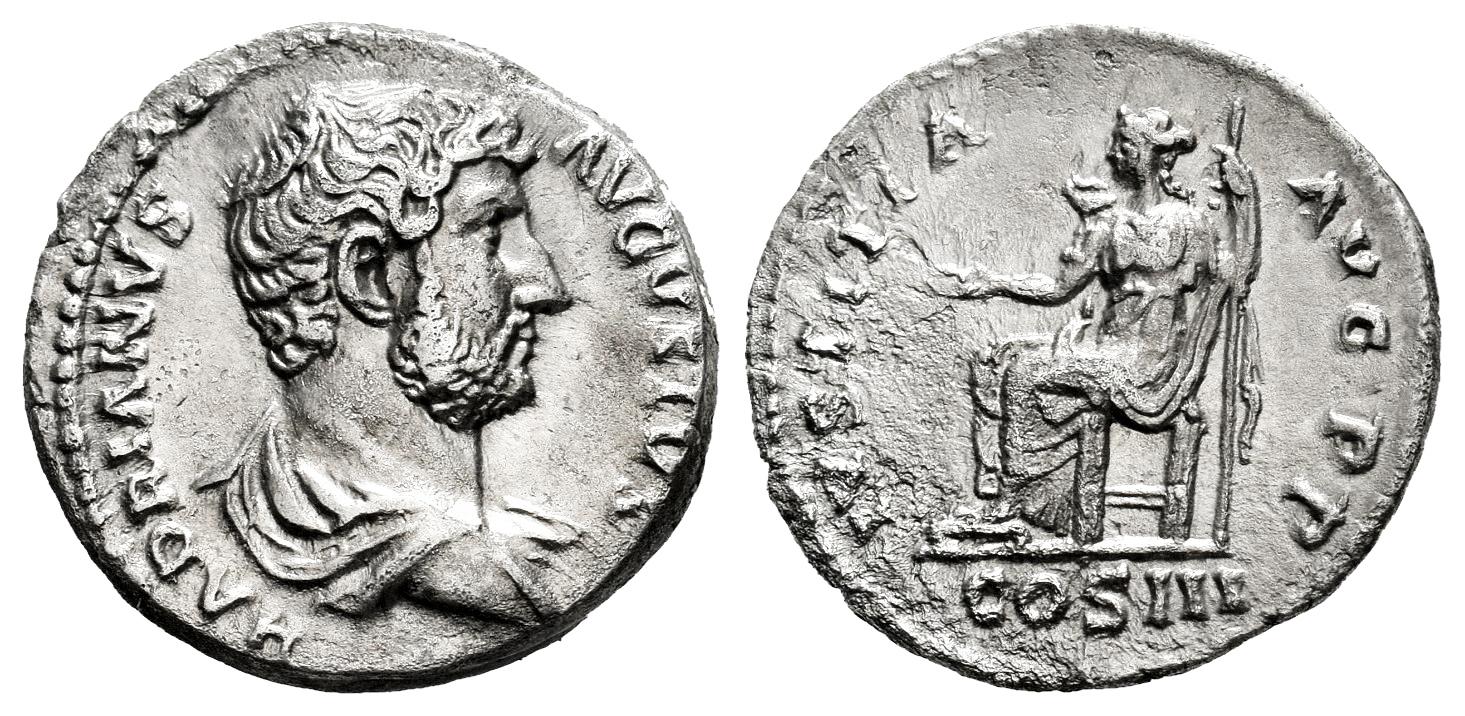 Hadrian. Denarius. 117-138 AD. Rome. (Ric-215c). (C-893,4,7). Anv.: HADRIANVS AVGVSTVS, bust draped, bare head to right. Rev.: IVSTITIA AVG P P, Justitia seated left on throne, holding patera and cornucopia; COS III in exergue. Ag. 2,93 g. Slight rust. Choice VF. Est...150,00.