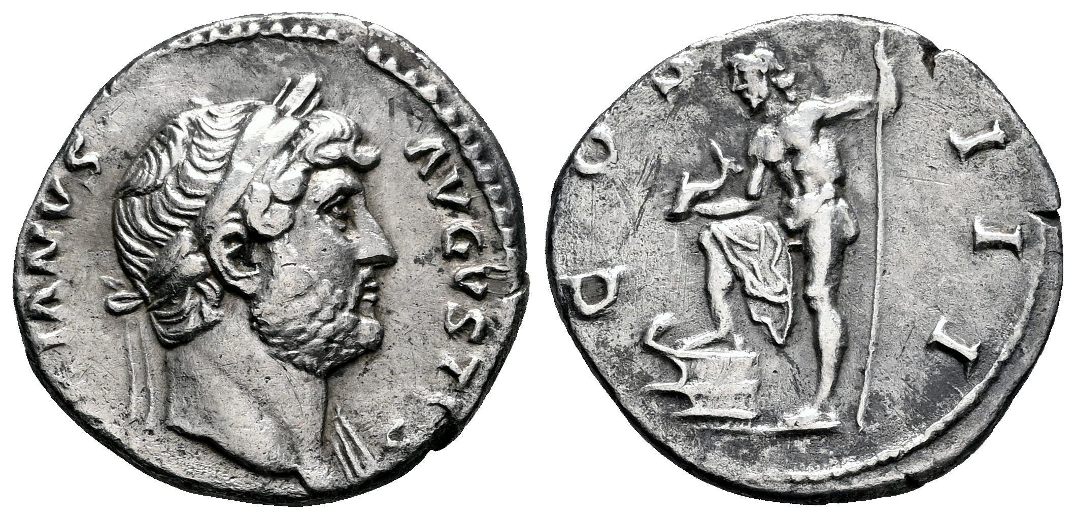 Hadrian. Denarius. 125-128 AD. Rome. (Ric-157). Anv.: HADRIANVS AVGVSTVS, laureate head right, slight drapery on left shoulder. Rev.: COS III, Neptune standing left, right foot on prow, holding trident and acrostolium. Ag. 2,92 g. Minor marks. Rare. Choice VF. Est...180,00.