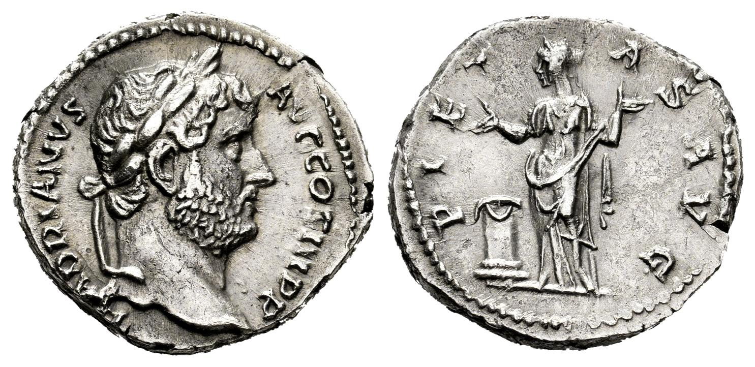 Hadrian. Denarius. 134-138 AD. Rome. (Ric-II 257). (Bmcre-685). (Rsc-1030). Anv.: HADRIANVS AVG COS III PP, bare head left. Rev.: PIETAS AVG, Pietas standing left, altar on ground, raising both hands. Ag. 3,77 g. Ex the Elliott-Kent Collection, Classical Numiamatic Group 232 (28/04/2010), lot 220. Almost XF. Est...160,00.