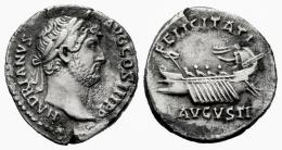 Hadrian. Denarius. 130 d.C. Rome. (Ric-II.3 1400). (Bmcre-621). (Rsc-712). Anv.: HADRIANVS AVG COS III P P, laureate head to right. Rev.: FELICITATI AVGVSTI, galley under oar to left. Ag. 2,88 g. VF/Choice VF. Est...150,00.