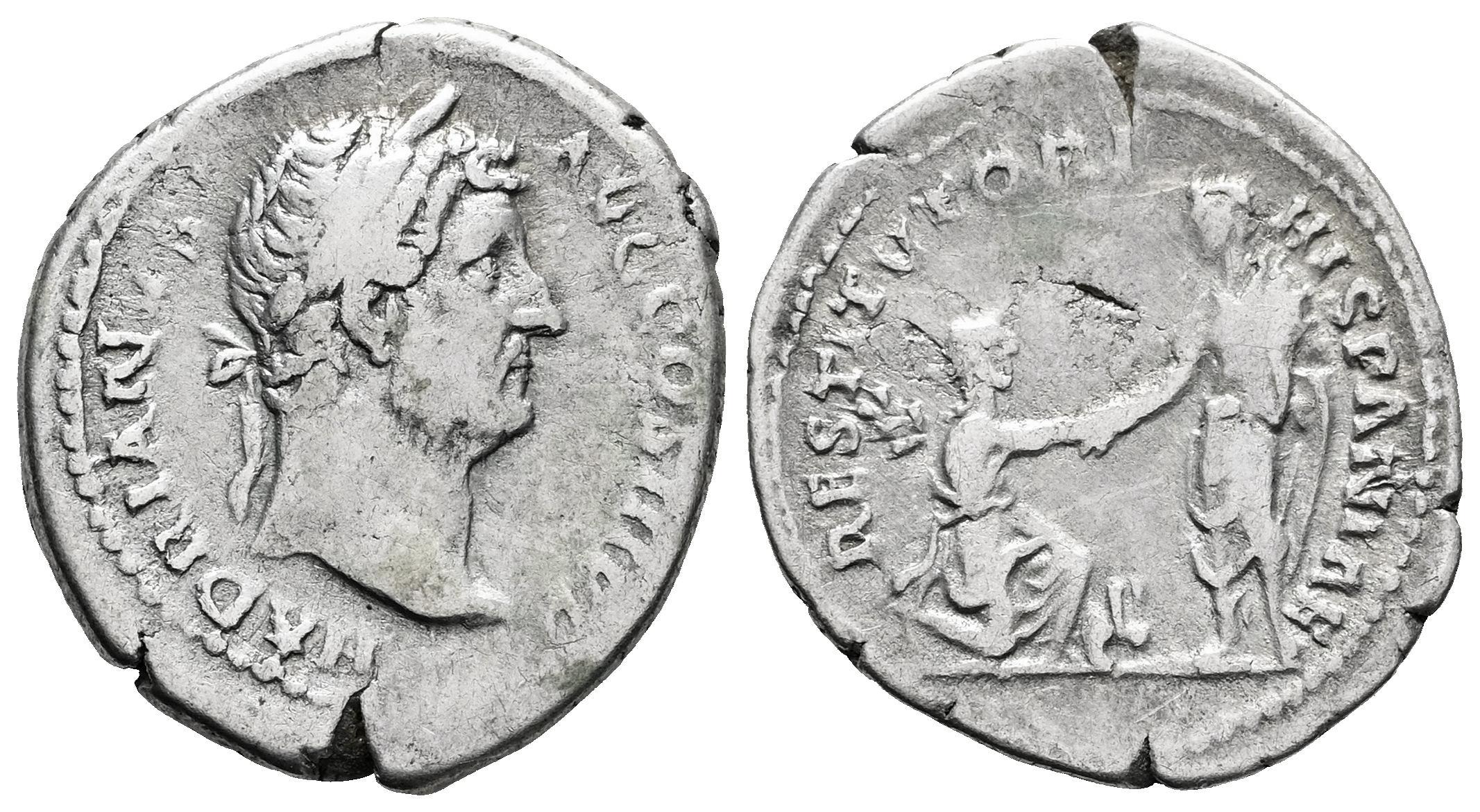 Hadrian. Denarius. 130-133 AD. Rome. (Ric-II 3 1580). (Bmcre-889). (Rsc-1260). Anv.: HADRIANVS AVG COS III P P, laureate head to right. Rev.: RESTITVTORI HISPANIAE, emperor standing to left, extending hand to raise kneeling figure of Hispania, holding branch; rabbit between them. Ag. 3,20 g. Choice F/Almost VF. Est...60,00.