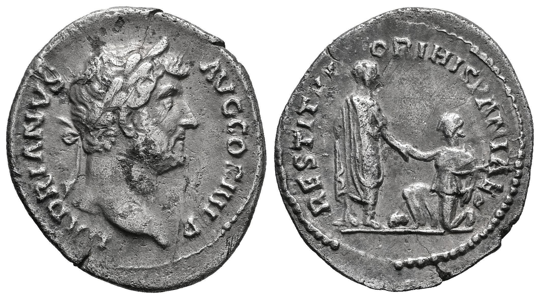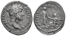 Hadrian. Denarius. 130-133 AD. Rome. (Ric-1584). (Cohen-1270). Anv.: HADRIANVS AVG COS III P P. Laureate head to right. Rev.: RESTITVTORI HISPANIAE. Hadrian, togate, standing right, holding scroll in his left hand and raising up Hispania, who kneels to left before him and holds an olive branch in her left hand. Ag. 2,88 g. Scarce. VF. Est...350,00.