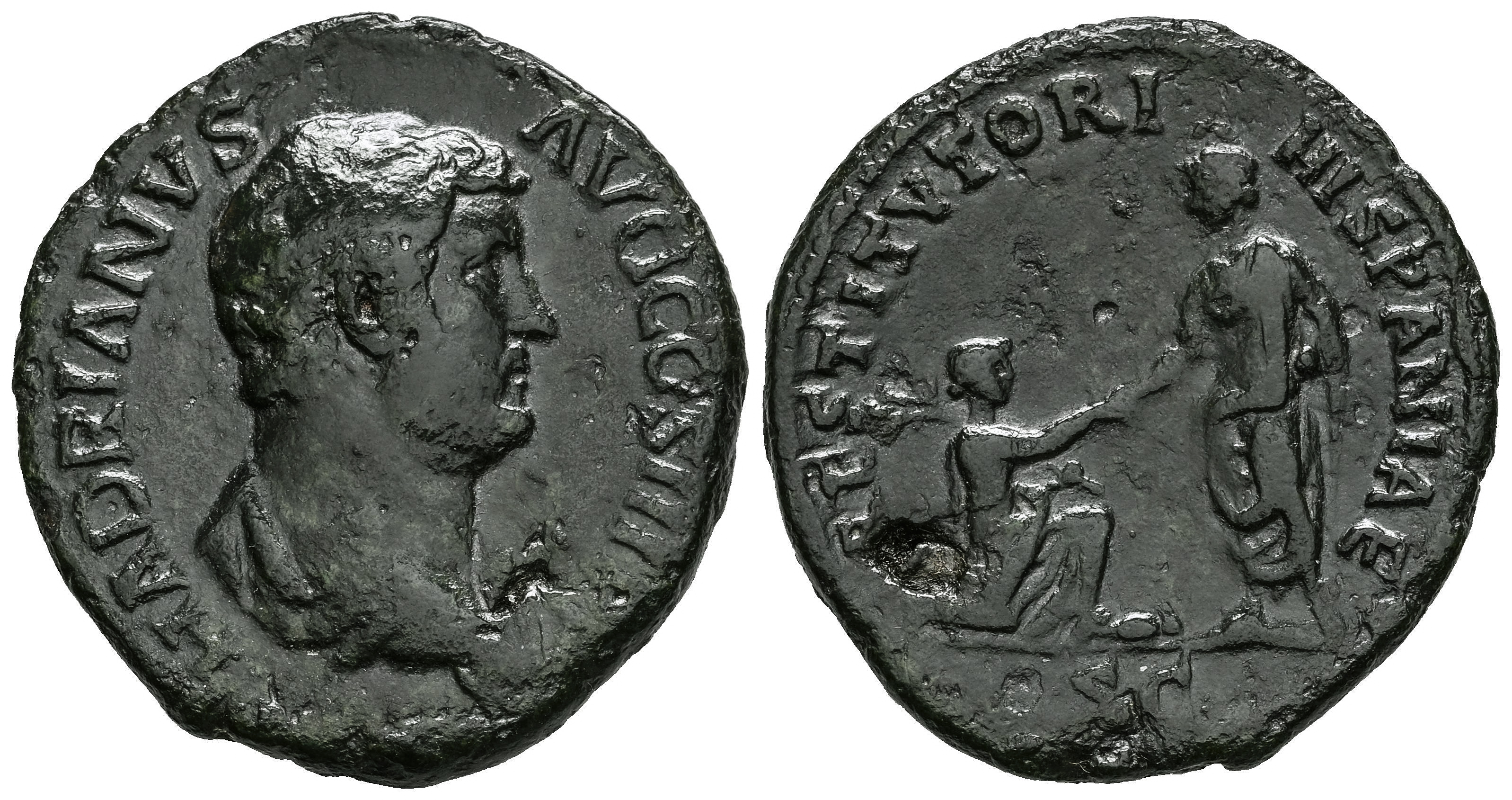 Hadrian. Unit. 130-133 AD. Rome. (Ric-II 3 1870). Anv.: HADRIANVS AVG COS III P P. Bareheaded and draped bust right. Rev.: RESTITVTORI HISPANIAE. Hadrian standing left, holding volumen and raising up kneeling Hispania who shoulders olive branch; rabbit between them, S C in exergue. Ae. 9,83 g. Cleaned. Very rare. Almost VF. Est...110,00.