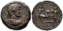 Hadrian. Drachm. RY 15 = 130/1 AD. Alexandria. Egypt. (Dattari-Savio 1596). (Köln-1038). (RPC-III 5782). Anv.: ΑΥΤ ΚΑΙ - ΤΡΑΙ ΑΔΡΙΑ ϹΕΒ, Laureate, draped and cuirassed bust right. Rev.: Hadrian, holding scepter, in quadriga right, being hailed by Alexandria; Nike flying left above, presenting wreath; L IE (date) in exergue. Ae. 24,89 g. Choice VF. Est...450,00.