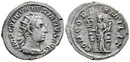 Valerian I. Antoninianus. 257 AD. Rome. (Ric-238). (MIR-36, 18d). (C-47). Anv.: IMP C P LIC VALERIANVS AVG. Radiate, draped and cuirassed bust to right. Rev.: CONCORDIA MILIT. Concordia standing left, holding military standard in each hand. Ag. 3,80 g. Very scarce. Choice VF. Est...100,00.