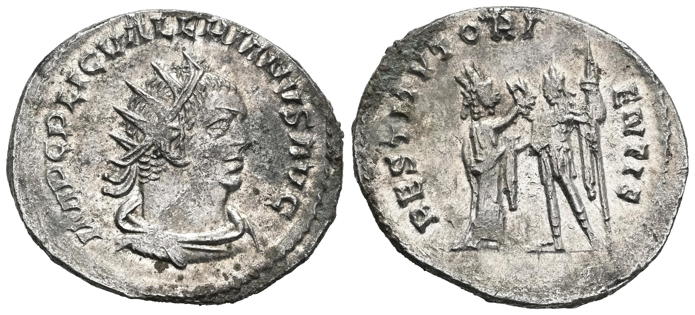 Valerian I. Antoninianus. 255-256 AD. Samosata. (Ric-V 1 286). (MIR-1677e). (C-188). Anv.: IMP C P LIC VALERIANVS AVG Radiate, draped and cuirassed bust to right. Rev.: RESTITVT ORIENTIS Oriens standing right, presenting wreath to emperor standing left, holding scepter. Bi. 3,64 g. Choice VF. Est...60,00.