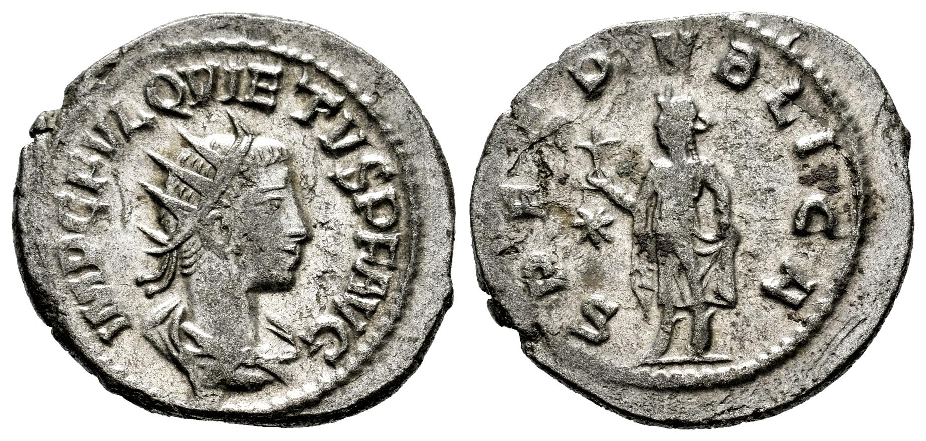 Quieto. Antoninianus. 260-261 AD. Samosata. (Ric-V 2 11). (MIR-1743n). Anv.: IMP C FVL QVIETVS P F AVG, radiate, draped and cuirassed bust to right. Rev.: SPES PVBLICA, Spes standing to left, raising robe and holding flower; star in left field. Bi. 3,93 g. A good sample for this type. XF/Choice VF. Est...180,00.