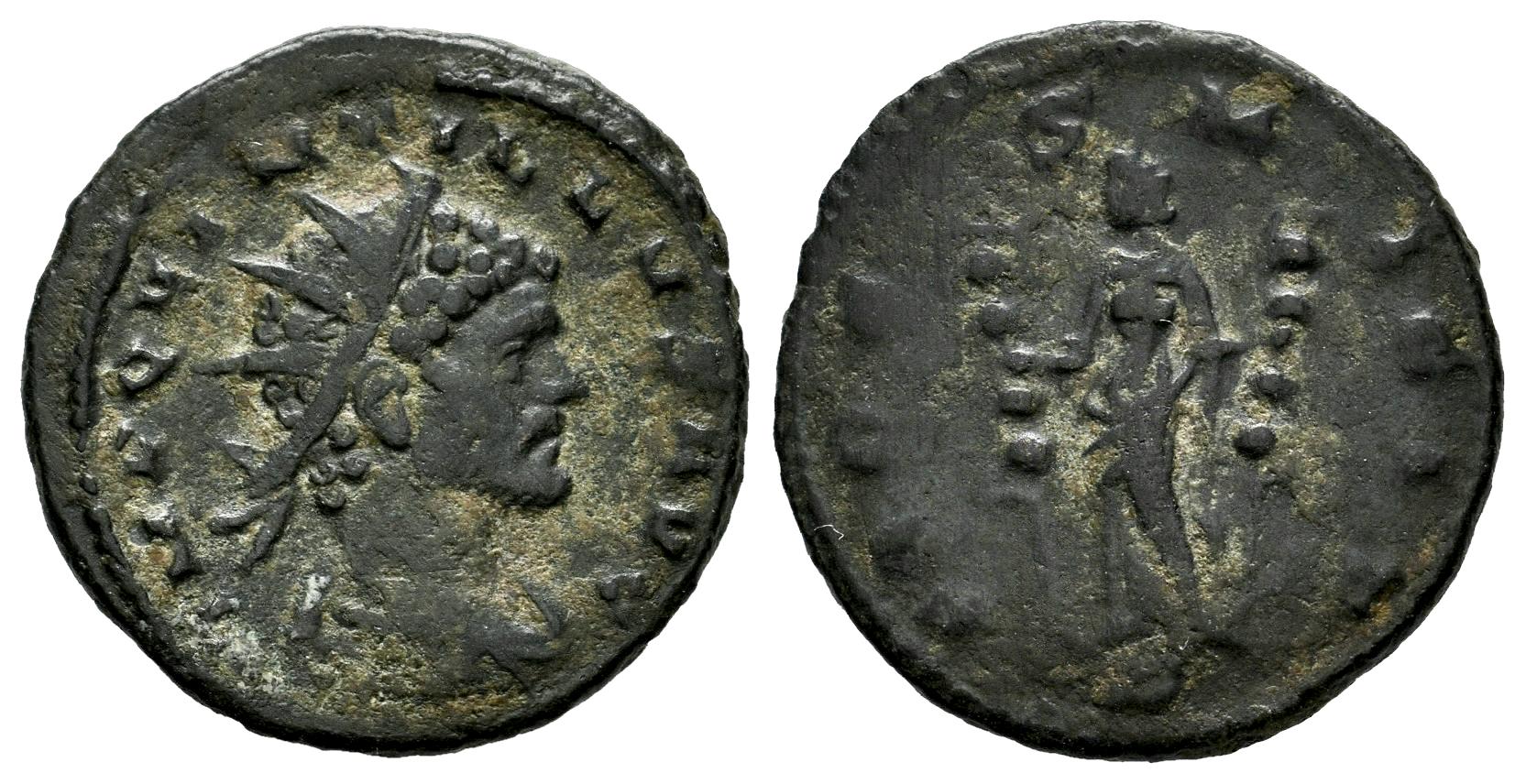 Quintillus. Antoninianus. 270 AD. Mediolanum. (Ric-V 1 52 var.). (MER/RIC-116 (temporary)). Anv.: IMP QVINTILLVS AVG, radiate, draped and cuirassed bust to right. Rev.: FIDES MILIT, Fides standing to left, holding two standards, S in exergue. Ae. 3,30 g. VF. Est...50,00.