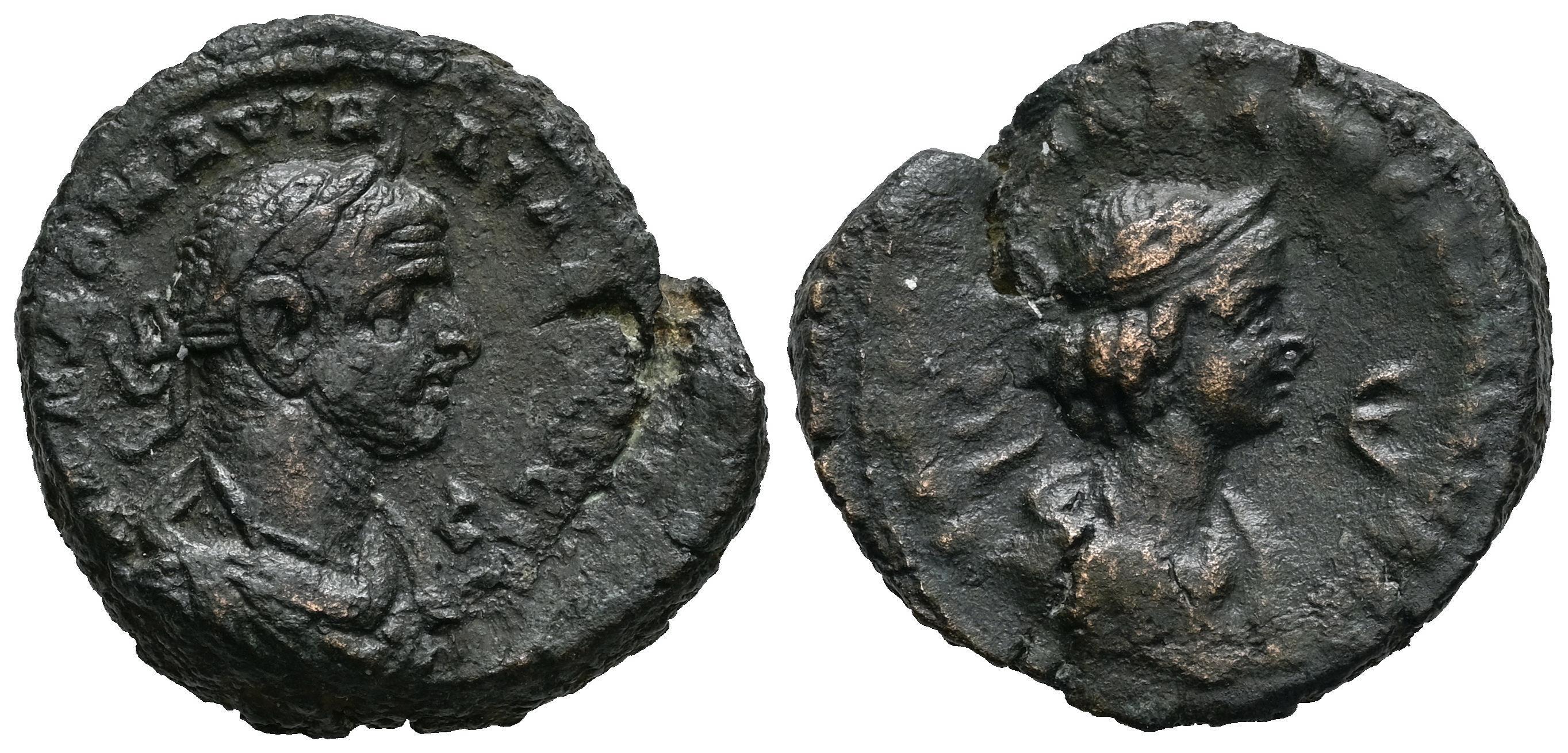 Vabalathus and Aurelian. Tetradrachm. RY 2 and RY 5 = 271/2 AD. Alexandria. Egypt. (Emmett-3914). Anv.: A K Λ ΔOM AVPHΛIANOC CЄB, laureate and draped bust right; LB (date) in right field. Rev.: A C OVABAΛΛAΘOC AΘHN V A C P, laureate, diademed and draped bust right, L-Є (date) across fields. Bi. 8,82 g. VF. Est...60,00.