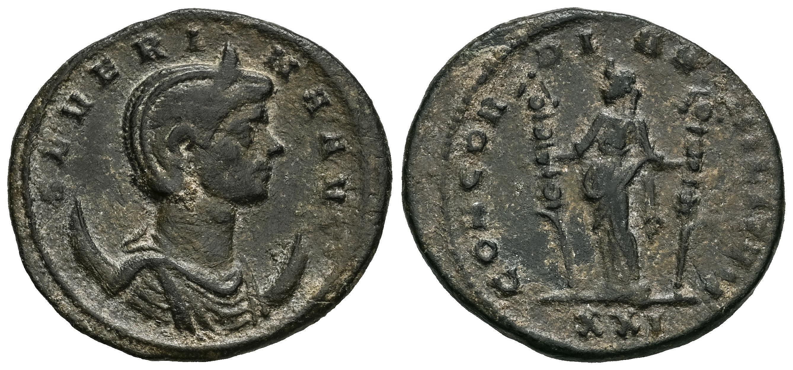 Severina. Antoninianus. 274-275 AD. Antioch. (Ric-20). Anv.: SEVERINA AVG. Diademed and draped bust to right, set on crescent. Rev.: CONCORDIAE MILITVM. Concordia standing facing, head to left, holding two standards; Q in left field, XXI in exergue. Bi. 4,20 g. Choice VF/VF. Est...50,00.