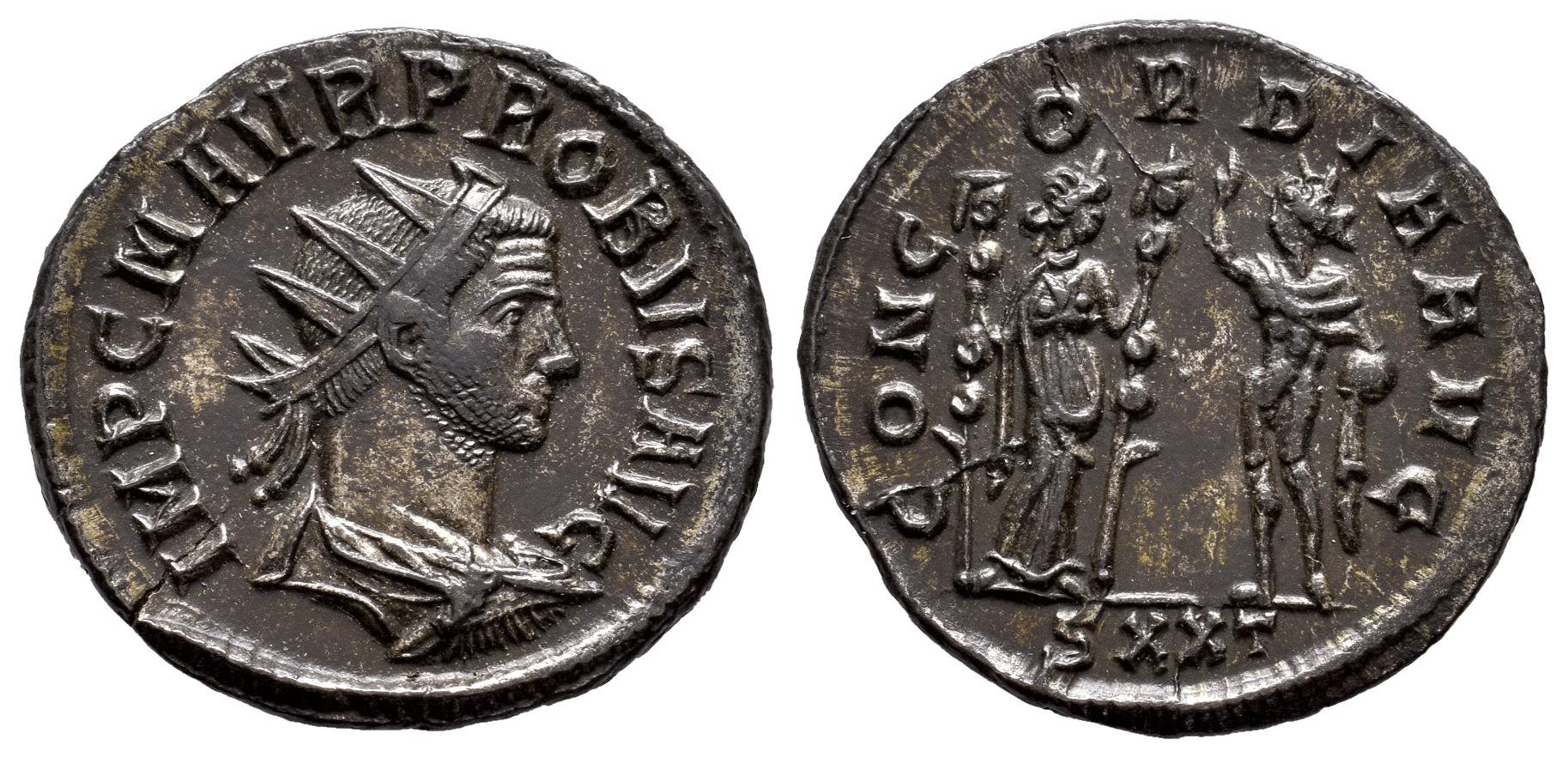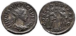 Probus. Antoninianus. 276 AD. Ticinum. (Ric-V 344 var.). Anv.: IMP C M AVR PROBVS AVG, radiate, draped, and cuirassed bust right. Rev.: CONCORDIA AVG, Concordia standing slightly right, holding signum in each hand, vis-à-vis Sol standing slightly left, raising hand and holding globe; SXXT in exergue. Bi. 3,29 g. Rare. Ex The White Mountain Collection, Classical Numismatic Group 225 (13/01/2010), lot 534. Almost XF. Est...100,00.