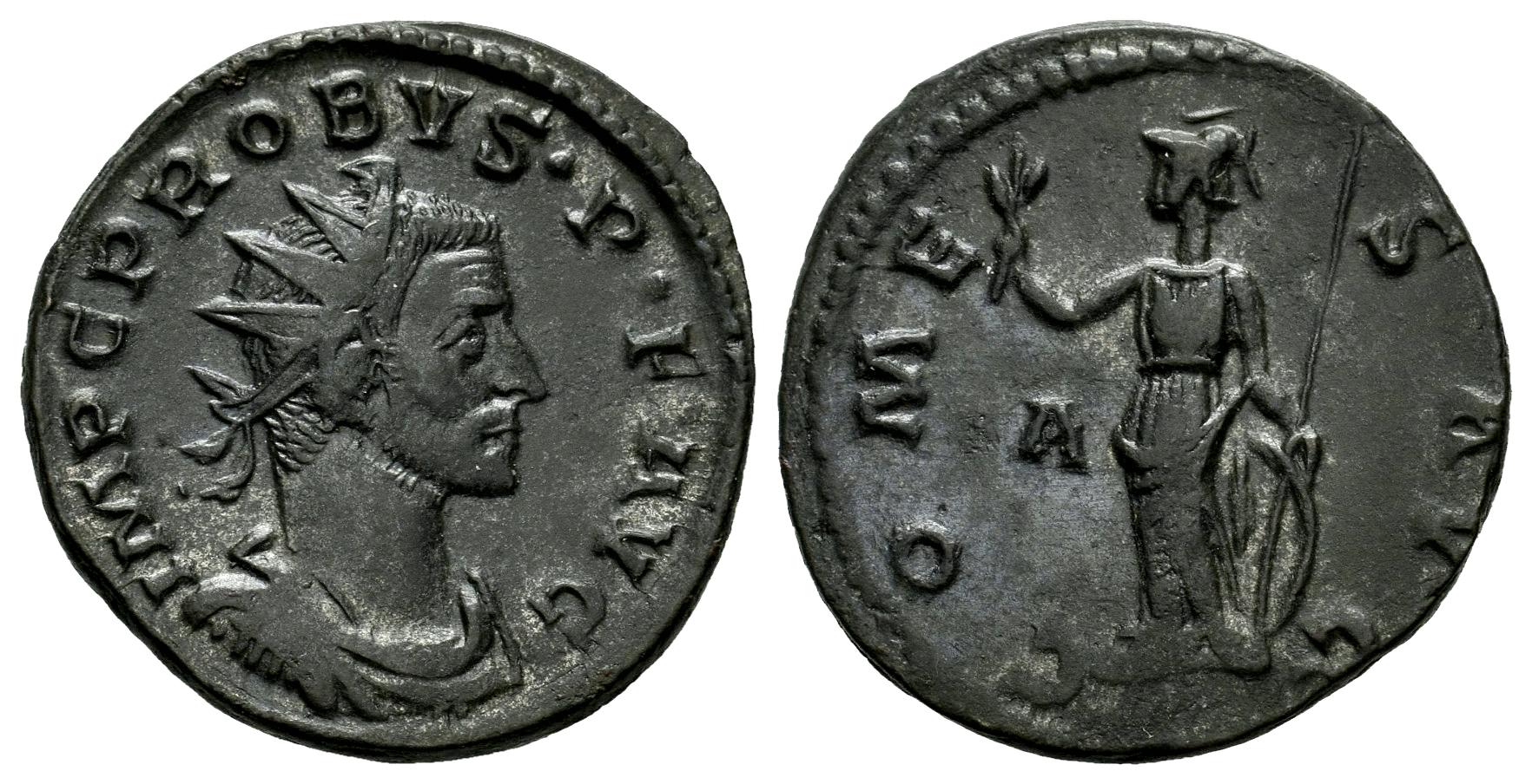 Probus. Antoninianus. 276-282 AD. Lugdunum. (Ric-V 2 116). (Bastien-375). Anv.: IMP C PROBVS·P·F·AVG, radiate and cuirassed bust to right. Rev.: COMES AVG, Minerva standing to left, holding olive branch and spear, resting hand on shield; A in left field. Bi. 3,64 g. Ex Vauctions 245 (24/04/2010), lot 94. Choice VF/VF. Est...50,00.