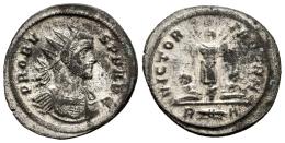 Probus. Antoninianus. 276-282 AD. Rome. (Ric-V 2 220). Anv.: IMP PROBVS P F AVG, radiate and cuirassed bust to right. Rev.: VICTORIA GERM, trophy between two captives; R(thunderbolt)A in exergue. Bi. 3,24 g. Original silvering. XF. Est...90,00.