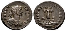 Probus. Antoninianus. 276-282 AD. Rome. (Ric-V 2 220). Anv.: IMP PROBVS P F AVG, radiate and cuirassed bust to right. Rev.: VICTORIA GERM, trophy between two captives; R(thunderbolt)A in exergue. Bi. 4,00 g. Choice VF. Est...45,00.
