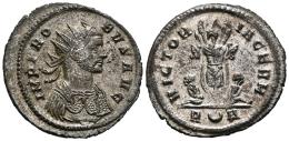 Probus. Antoninianus. 276 AD. Rome. (Ric-V.2 222). Anv.: IMP PROBVS AVG, radiate and cuirassed bust to right. Rev.: VICTORIA GERM, two bound captives seated back to back on either side of a trophy; R(crescent with pellet)A in exergue. Ae. 3,54 g. Silvering. Ex Gerhard Hirsch Nachfolger 271 (17/02/2011), lot 2556. AU. Est...70,00.