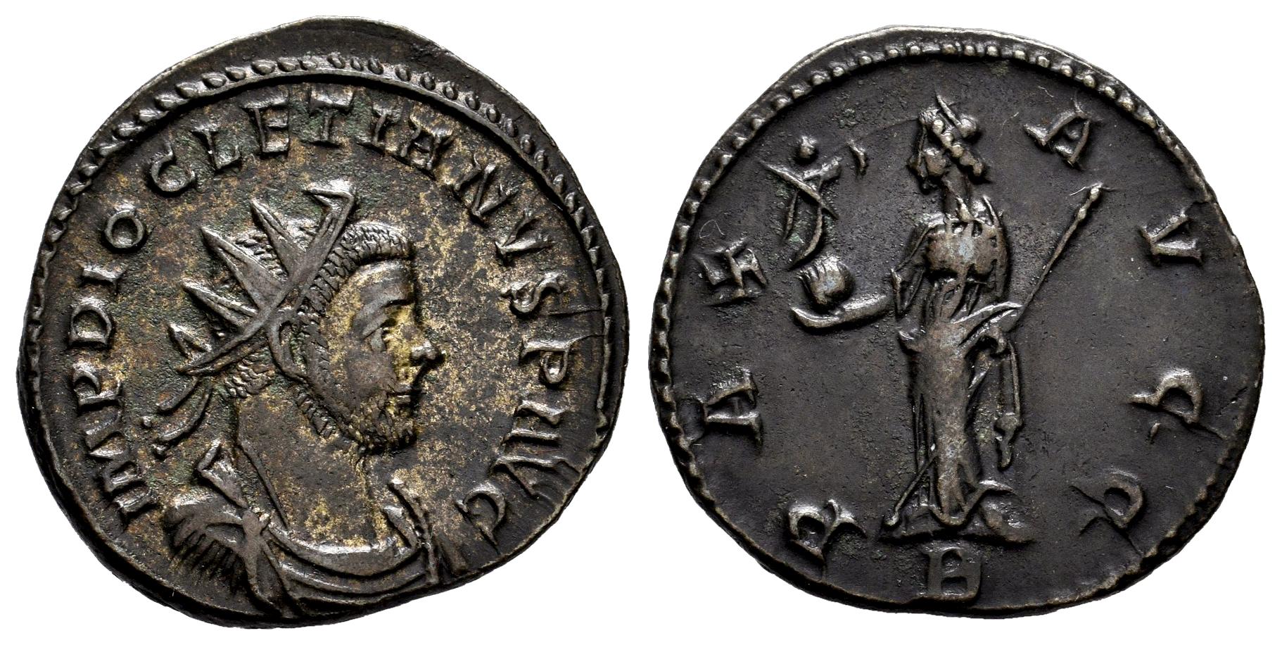 Diocletian. Antoninianus. 290-293 AD. Lyon. (Ric-66). Anv.: IMP DIOCLETIANVS P AVG. radiate draped and cuirassed bust to right. Rev.: PAX AVGG. Pax standing left, holding Victory on globe and sceptre, B in exergue. Bi. 3,58 g. Ex Fritz Rudolf Künker (26/09/2010) Coin shop. VF. Est...50,00.