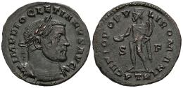 Diocletian. Follis. 303-305 AD. Trier. (Ric-582a). Anv.: IMP DIOCLETIANVS AVG. Laureate and cuirassed bust of Diocletian to right. Rev.: GENIO POPV-LI ROMANI / S - F / PTR. The Genius of the Roman people standing front, head to left, holding patera in his right hand and cornucopiae in his left. Ae. 7,61 g. Almost XF/Choice VF. Est...45,00.