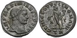 Maximianus Herculius. Follis. 296-297 AD. Trier. (Ric-VI 181b). Anv.: IMP MAXIMIANVS P AVG, laureate head to right. Rev.: GENIO POPVLI ROMANI, Genius standing to left, wearing modius, holding patera and cornucopiae; A-Γ across fields, TR in exergue. Bi. 10,22 g. Minor mark on obverse. Choice VF. Est...50,00.