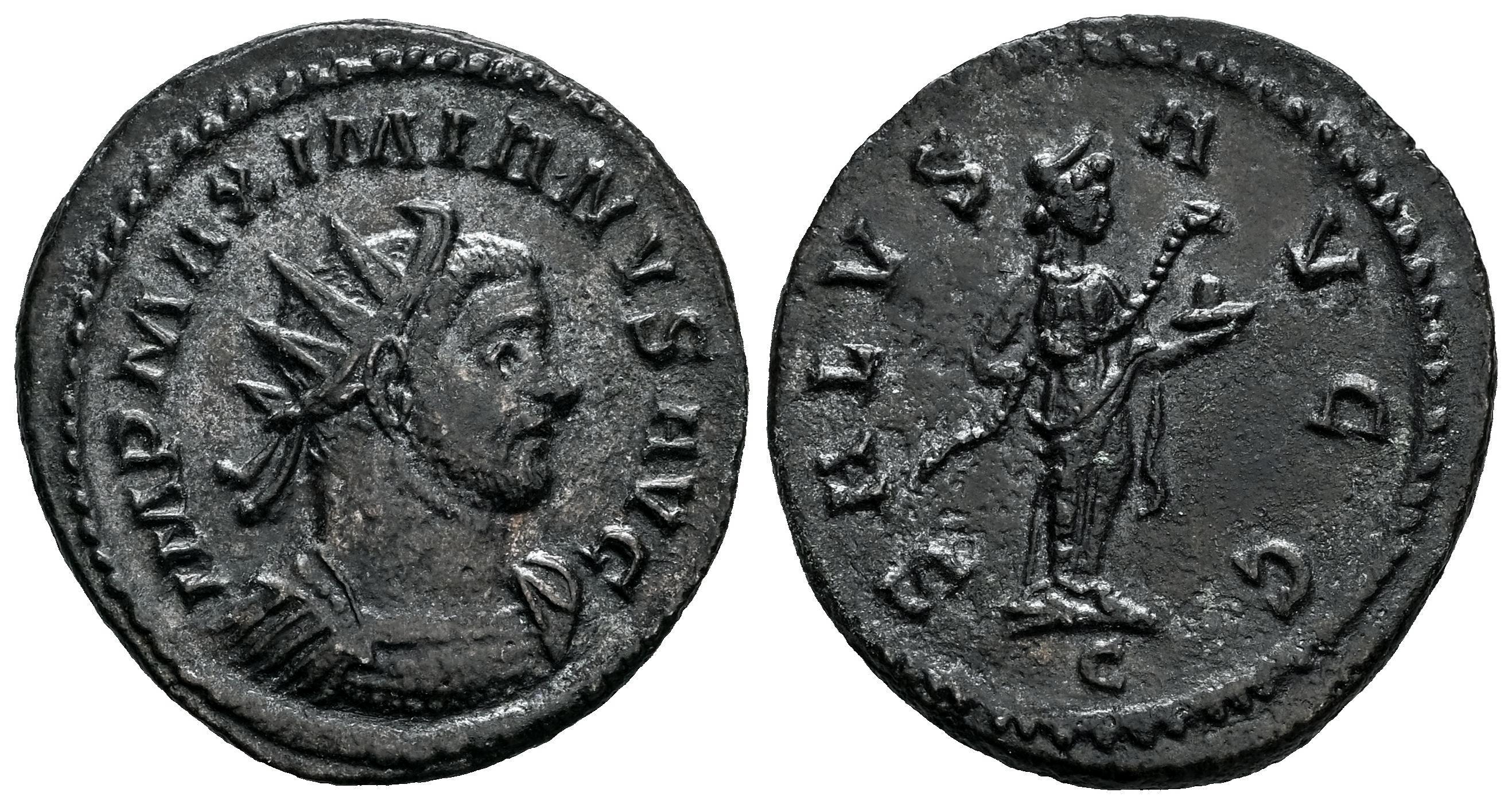 Maximianus. Antoninianus. 290-294 d.C. Lugdunum. (Ric-422). Anv.:  IMP MAXIMIANVS AVG, radiate, cuirassed bust right. Rev.: SALVS AVGG, Salus standing right, holding patera, feeding serpent on her arm, C in exergue. Ae. 4,49 g. VF. Est...30,00.