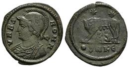 Constantinus I. Commemorative Series. Follis. 332-335 AD. Cyzicus. (Ric-205). Anv.: VRBS ROMA, helmeted bust of Roma left wearing imperial cloak. Rev.: She-wolf left, suckling Romulus and Remus, two stars above; •SMKЄ in exergue. Ae. 2,16 g. Scarce. VF. Est...40,00.