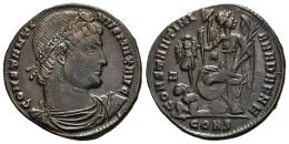 Constantinus I. Follis. 328 AD. Constantinople. (Ric-VII 35). Anv.: CONSTANTINVS MAX AVG, rosette-diademed, draped and cuirassed bust to right. Rev.: CONSTANTINIANA DAFNE, Victory seated to left on cippus, holding palm branch and laurel branch, looking to right; trophy in front, at the foot of which captive kneeling to left, turning head back to right, spurned by Victory; Z in left field, CONS in exergue. Ae. 2,68 g. Attractive. Choice VF. Est...60,00.