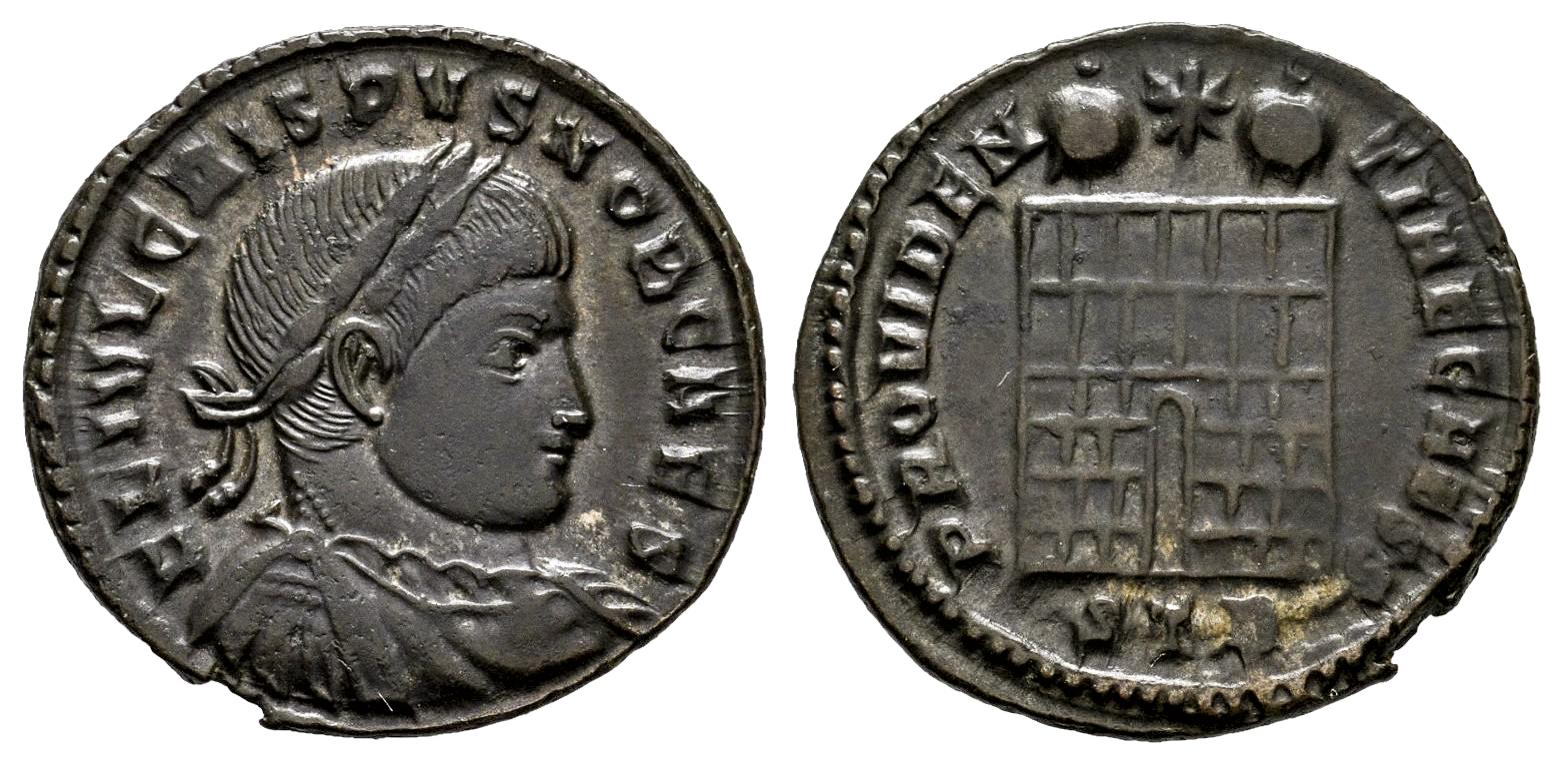 Crispus. Follis. 324-325 AD. Trier. (Ric-VII 451). Anv.: FL IVL CRISPVS NOB CAES, laureate, draped and cuirassed bust to right. Rev.: PROVIDENTIAE CAESS, camp gate with no doors and two turrets; star above, STR in exergue. Ae. 2,53 g. Ex Vauctions 244 (01/04/2010), lot 122. Ex Zachary Beasley Collection. Choice VF. Est...50,00.