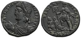 Constantius II. Follis. 348-350 AD. Cyzicus. (Ric-70). Anv.: D N CONSTANTIVS P F AVG Pearl-diademed, draped and cuirassed bust to left, holding globe in his right hand. Rev.: FEL TEMP REPARATIO. Constantius II, in military attire, standing front, head to left, holding labarum in his right hand and placing his left on shield set on ground; before him to left, two captives; ·SMKS in exergue. Ae. 4,38 g. Choice VF. Est...45,00.