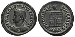 Constantius II. Follis. 337-361 AD. Nicomedia. (Ric-VII 124). Anv.: FL IVL CONSTANTIVS NOB C. Laureate, draped and cuirassed bust left. Rev.: PROVIDENTIAE CAESS. Camp gate with five rows, no doors and two turrets; star above, MNΔ in exergue. Ae. 3,05 g. Choice VF. Est...40,00.