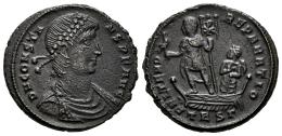 Constans. Centenionalis. 348-350 d.C. Thessalonica. (Ric-109). Anv.: DN CONSTANS PF AVG. Pearl-diademed, draped and cuirassed bust right. Rev.: FEL TEMP REPARATIO. Constans standing left on galley holding phoenix and labarum, at stern sits Victory, steering the ship; TESΓ in exergue. Ae. 6,26 g. Almost XF. Est...30,00.