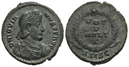 Jovian. Follis. 363-364 AD. Siscia. (Ric-VIII 426). Anv.: D N IOVIANVS P F AVG, pearl-diademed, draped and cuirassed bust to right. Rev.: Wreath enclosing VOT V MVLT X, written in four lines; ASISC in exergue. Ae. 2,66 g. VF. Est...40,00.