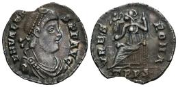 Valens. Siliqua. 367-375 AD. Trier. (Ric-IX 27e). (Rsc-109b). Anv.: D N VALENS P F AVG, pearl-diademed, draped and cuirassed bust to right. Rev.: VRBS ROMA, Roma seated to left on throne, holding Victory on globe and spear; TRPS in exergue. Ag. 1,97 g. Patina. Lightly toned. Slight planchet break. Choice VF. Est...120,00.