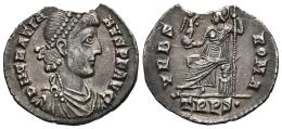 Gratian. Siliqua. 367-375 AD. Trier. (Ric-IX 27f). (Rsc-86). Anv.: D N GRATIANVS P F AVG, pearl-diademed, draped and cuirassed bust to right. Rev.: VRBS ROMA, Roma seated to left, holding spear and Victory on globe; TRPS• in exergue. Ag. 1,91 g. Delicate patina with lightly tone. Planchet break. XF. Est...150,00.