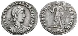 Valentinian II. Siliqua. 378-383 AD. Trier. (Ric-IX 57a). (Rsc-40a). Anv.: D N VALENTINIANVS IVN P F AVG, pearl-diademed, draped and cuirassed bust to right. Rev.: VICTORIA AVGGG, Victory advancing to left, holding wreath and palm; TRPS in exergue. Ag. 1,64 g. Planchet crack. VF. Est...150,00.