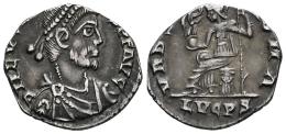 Eugenius. Siliqua. 392-394 AD. Lugdunum. (Ric-IX 46). (Rsc-18a). Anv.: D N EV(GENIVS) P F AVG. pearl-diademed, draped and cuirassed bust to right. Rev.: VRB(S R)OMA. Roma seated to left on cuirass, holding Victory on globe and inverted spear; LVGPS in exergue. Ag. 1,54 g. Delicate patina. Rare. Choice VF. Est...500,00.