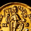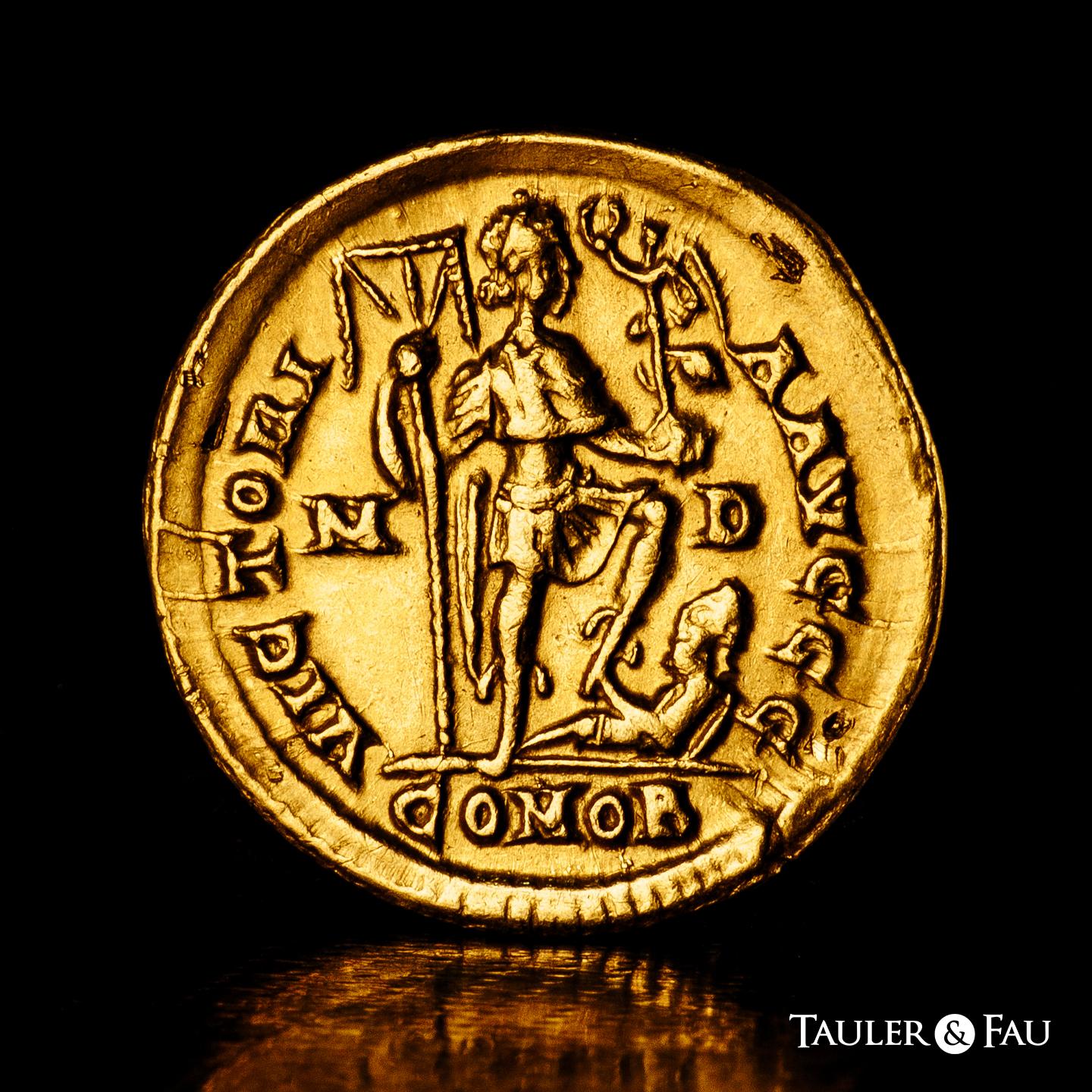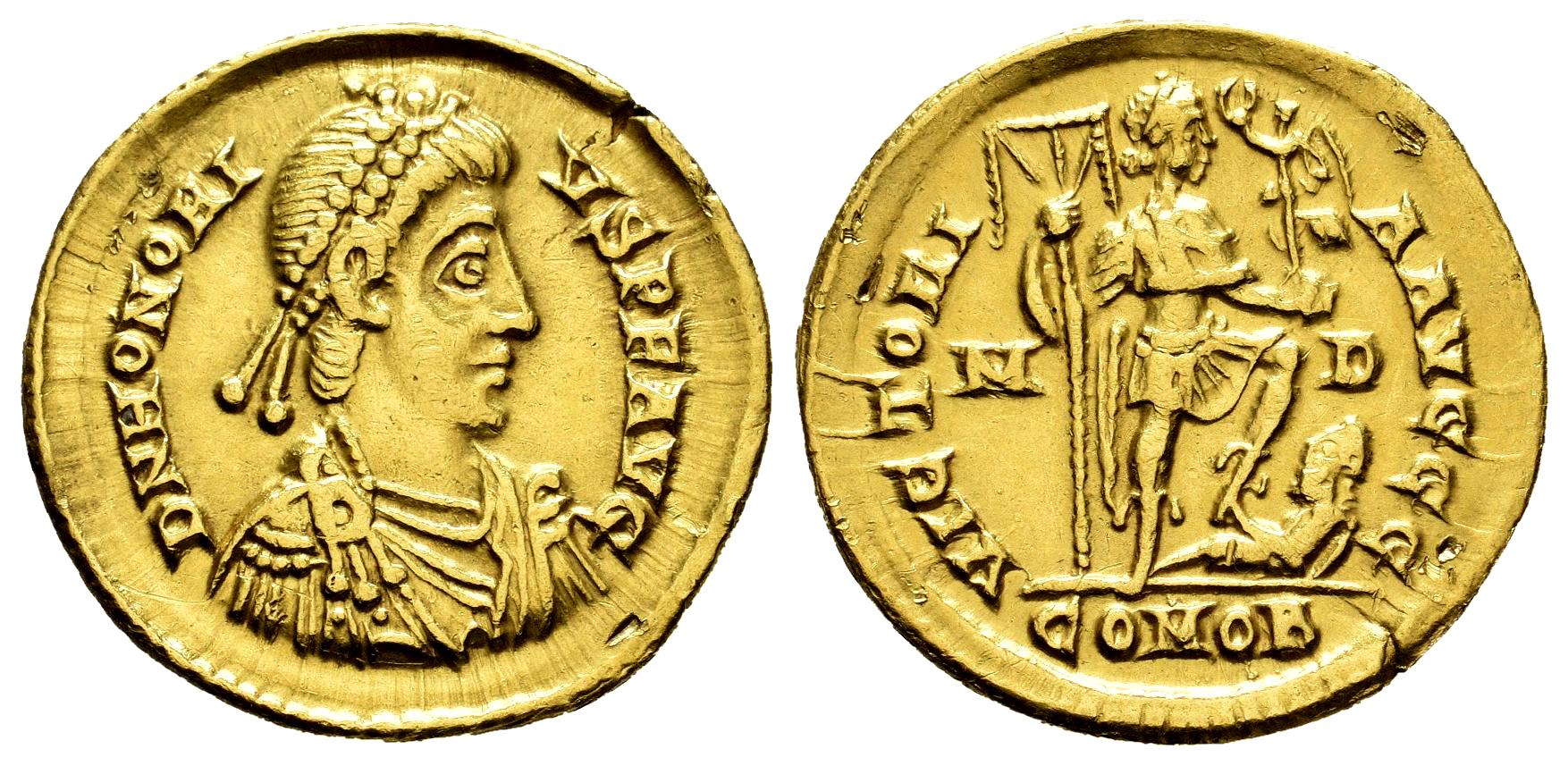 Honorius. Solidus. 394-395 AD. Mediolanum. (Ric-IX 35c = X 1206). (Depeyrot-16/2). (Toffanin-486/2). Anv.: D N HONORIVS P F AVG, pearl-diademed, draped and cuirassed bust to right. Rev.: VICTORIA AVGGG, emperor standing to right, holding labarum and Victory on globe, treading on captive to right; M-D across fields, COMOB in exergue. Au. 4,45 g. Minimal grip marks. Attractive. Choice VF. Est...850,00.