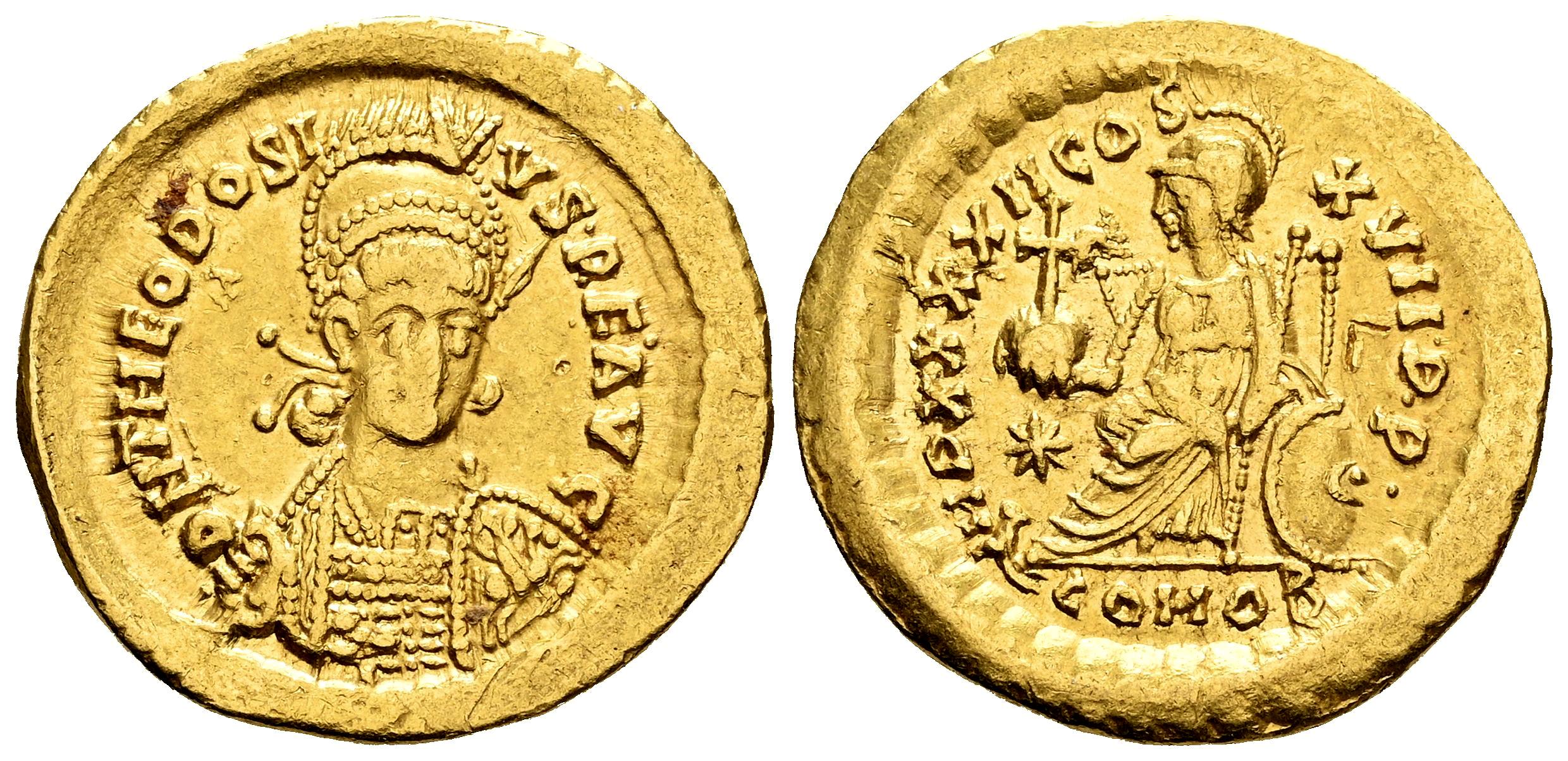 Theodosius II. Solidus. 443-450 AD. Constantinople. (Ric-X 292). (Depeyrot-84/1). Anv.: Pearl-diademed, helmeted, and cuirassed bust facing slightly right, holding spear over shoulder and shield. Rev.: Constantinopolis seated left on throne, holding globus cruciger and scepter, foot on prow; shield to right side side of throne; star to left; CONOB. Au. 4,42 g. Choice VF. Est...750,00.