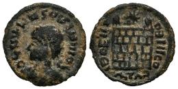 AE 15. Circa 4/5th century AD. Barbarous imitation. Anv.: DGIDLLUSUISIISIIIOS, pearl-diademed, draped and cuirassed bust to left. Rev.: IBoEiiT-DBIIICO,, camp gate with no doors, two turrets, star above; MTAB? in exergue. Ae. 1,28 g. Almost VF/VF. Est...40,00.