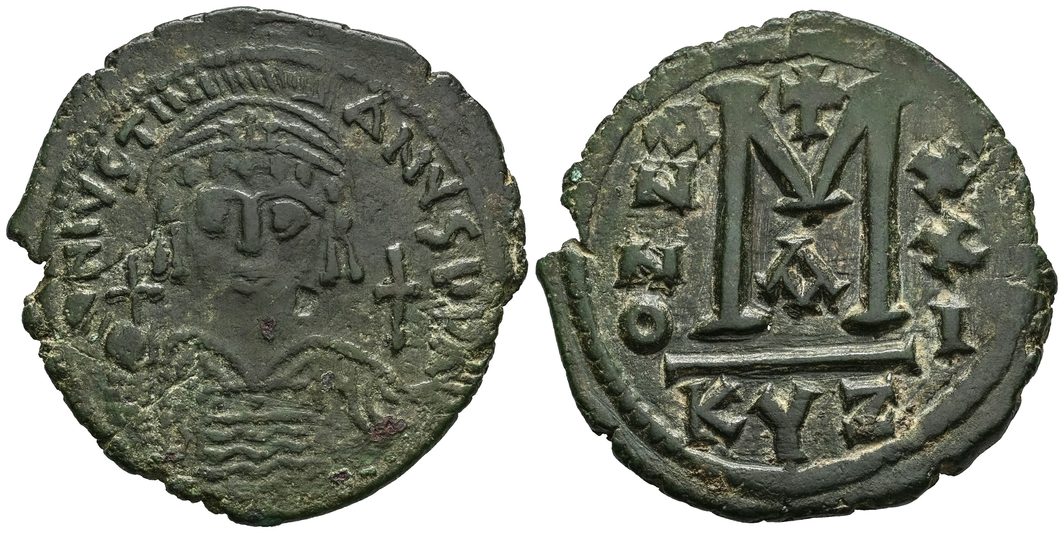 Justinian I. 40 Nummi. RY 21 = 547/8 AD. Cyzicus. (MIBE-120a). (Doc-173a). (Sear-207). Anv.: D N IVSTINIANVS P P AV, helmeted and cuirassed facing bust, holding globus cruciger and shield; cross to right. Rev.: Large M, cross above; A below, ANNO to left, XXI (date) to right, KYZ below. Ae. 17,33 g. Green patina. VF/Choice VF. Est...70,00.