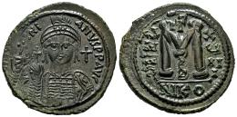Justinian I. Follis. RY 28 (554/5 AD). Nicomedia. (Doc-I 134b). (MIB-I 113a). (Seaby-201). Anv.: D N IVSTINIANVS P P AVG, diademed, helmeted, and cuirassed facing bust, holding globus cruciger and shield; cross to right. Rev.: Large M; cross above, ANNO X/X/U/II/I across field; B/NIKO. Ae. 20,58 g. Light double strike on obverse. Attractive specimen. XF. Est...180,00.